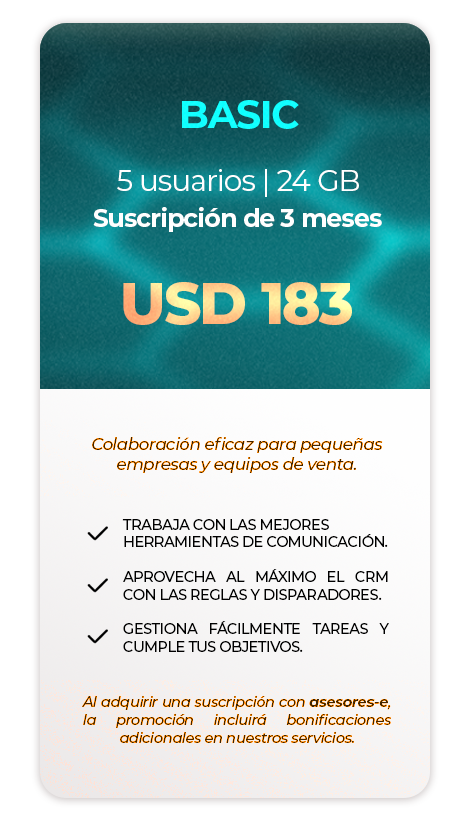 La promoción Diciembre: El regalo del futuro, te permite disfrutar descuentos en las nuevas suscripciones anuales Oncloud Basic 25%, Standard/Professional 30% y Enterprise 35%; así como para Nuevas Suscripciones OnPremise Business 50-500-1000 con un 15% y OnPremise Upgrade para todas del 25%. Promoción válida desde el 1ro hasta el 31 de diciembre del 2025. Aplica también, a aquellos que desean actualizar a una suscripción superior Anual. También aplica "solo para aquellas renovaciones mensuales o trimestrales" que desean cambiar su frecuencia de renovación a ANUAL, manteniendo la misma suscripción, requisito indispensable: la desactivación de la renovación automática en su instancia, para que puedan optar por esa oportunidad. Los descuentos no son válidos para renovaciones o actualizaciones al mismo plan que fue activado en la cuenta Oncloud dentro de los 30 días anteriores al inicio de esta Oferta. Tenga en cuenta: los descuentos de Upgrade Onpremise son válidos solo para activaciones de Onpremise realizadas antes del 1 de diciembre de 2025. Las actualizaciones requieren una suscripción Onpremise activa. Esta oferta no se puede combinar con otros descuentos u ofertas especiales, ni se puede extender más allá del período de suscripción original adquirido con este descuento. Todas las futuras renovaciones de suscripción se facturarán a un precio regular. Si tienes alguna pregunta o duda, comunícate con ventas@asesores-e.com.
