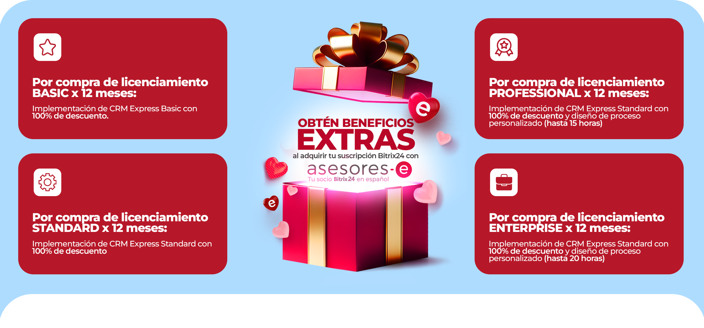 La promoción FEBRERO: Amor a primera implementación te permite disfrutar descuentos en todas las nuevas suscripciones on cloud anuales de un 20%. Para las cuentas Professional y Enterprise incluye gratis: CRM Express tu crm listo para usar + Diseño de un proceso de negocio personalizado y para las cuentas Basic y Standard: CRM Express, tu crm listo para trabajar. Promoción válida desde el 1ro hasta el 28 de febrero del 2026. Aplica también, a aquellos que desean actualizar a una suscripción superior anual. Esta oferta no se puede combinar con otros descuentos u ofertas especiales, ni se puede extender más allá del período de suscripción original adquirido con este descuento. Todas las futuras renovaciones de suscripción se facturarán a un precio regular. Si tienes alguna pregunta o duda, comunícate con ventas@asesores-e.com.